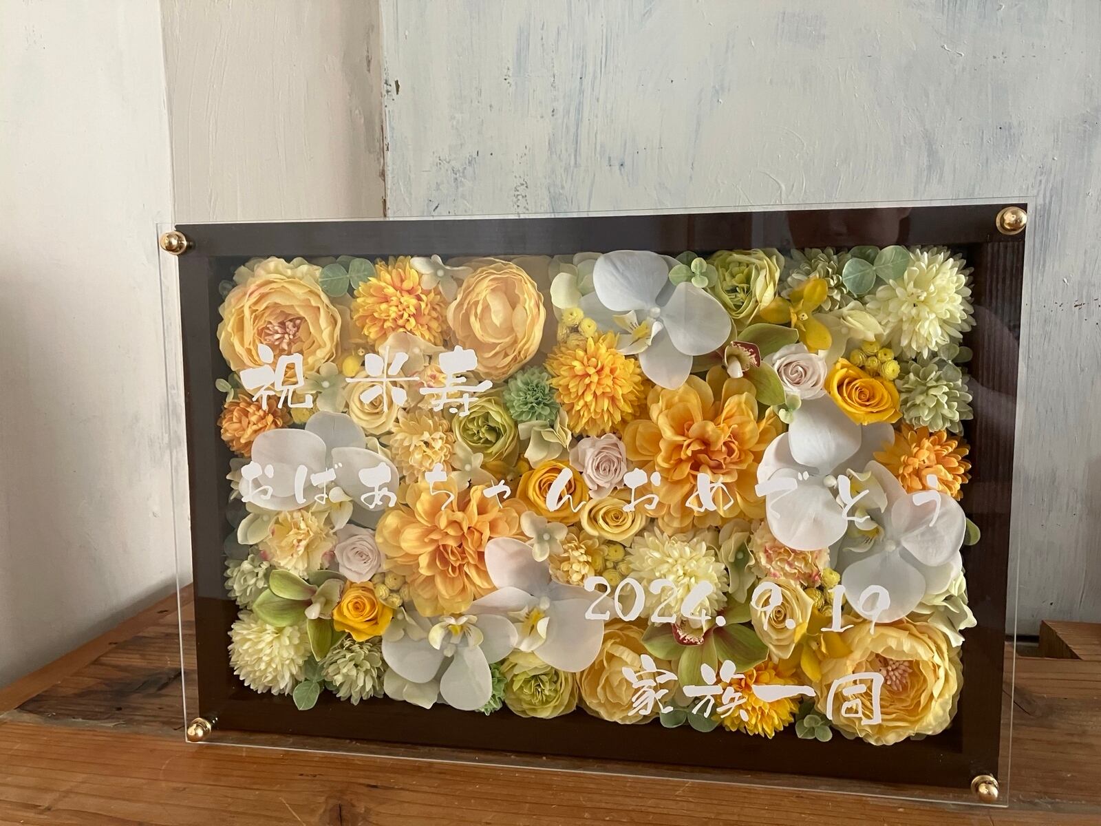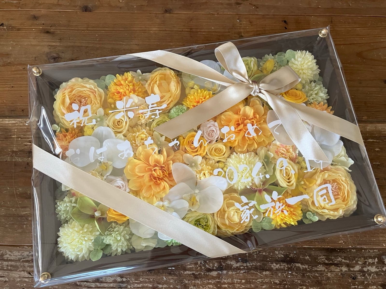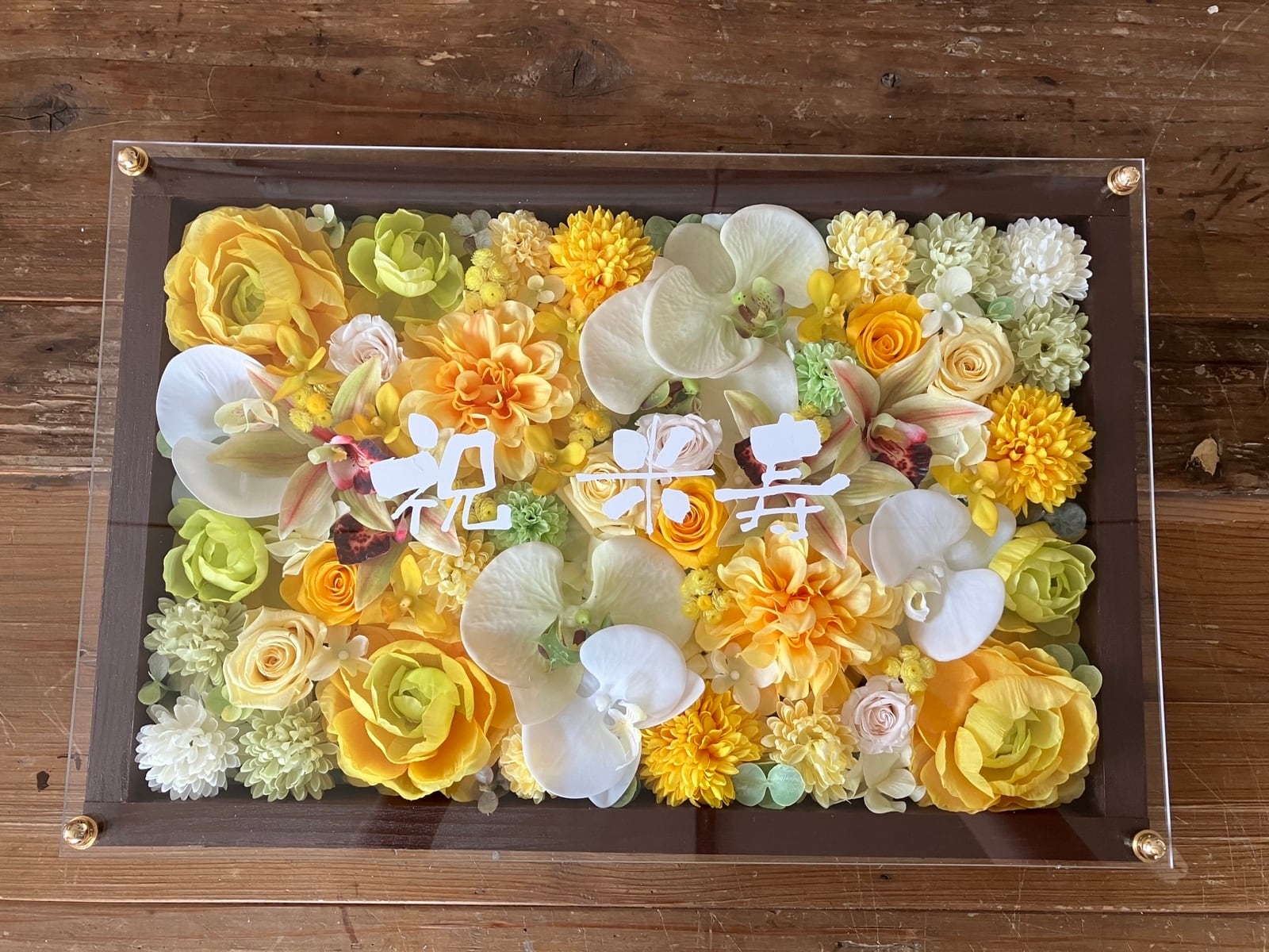 お花いっぱいのギフト|プリザーブドフラワーアレンジ ウッドフレーム〈イエロー〉名入れ可/米寿・開店・開院祝いに