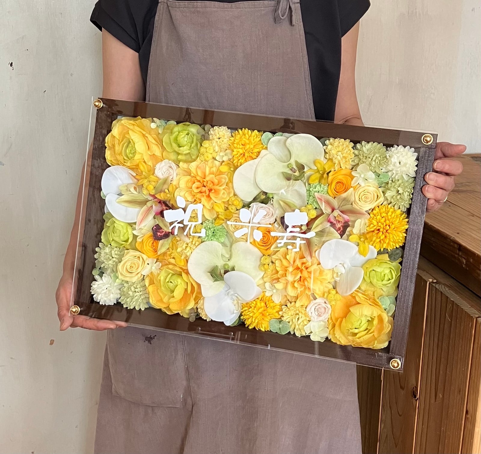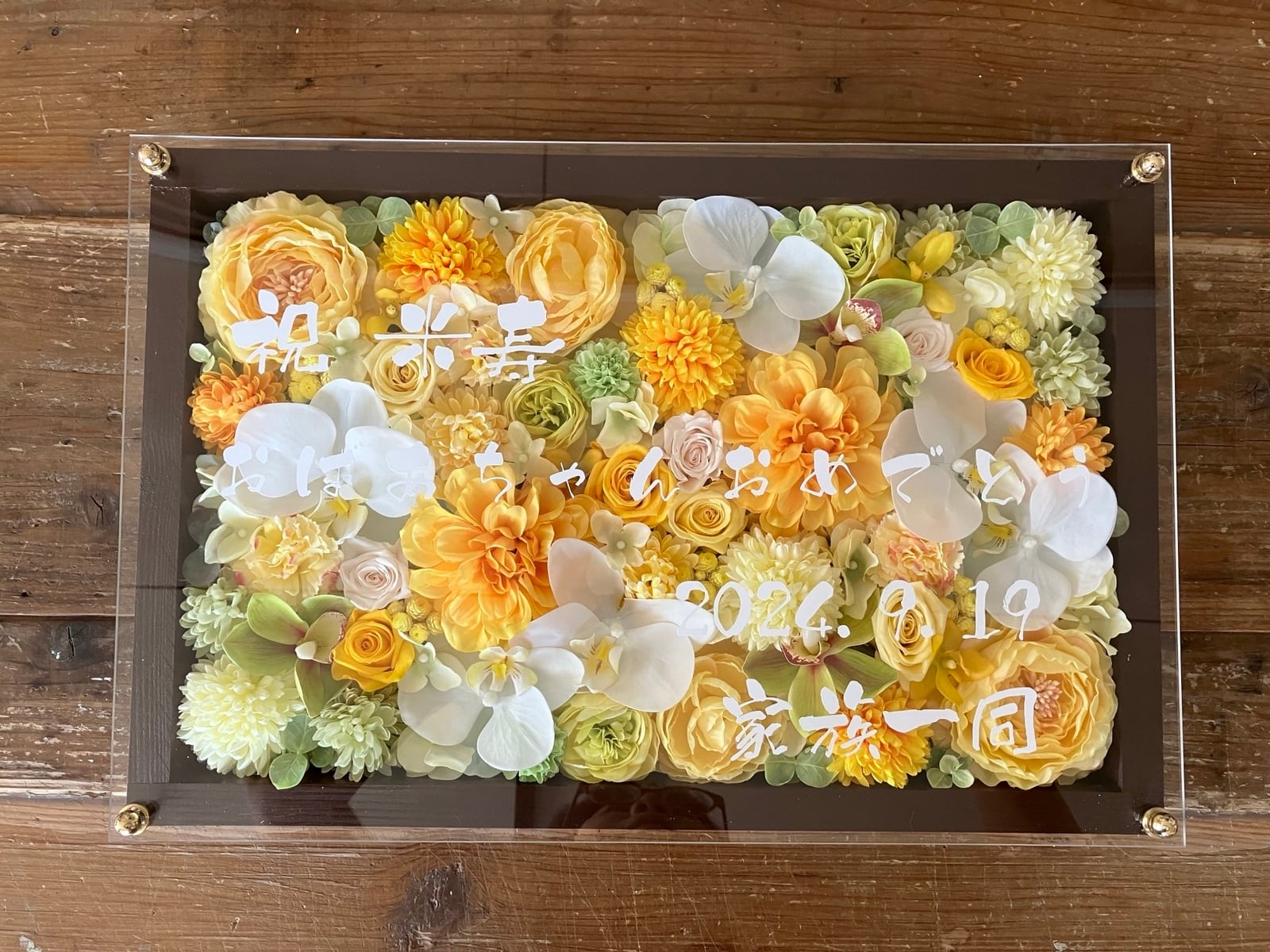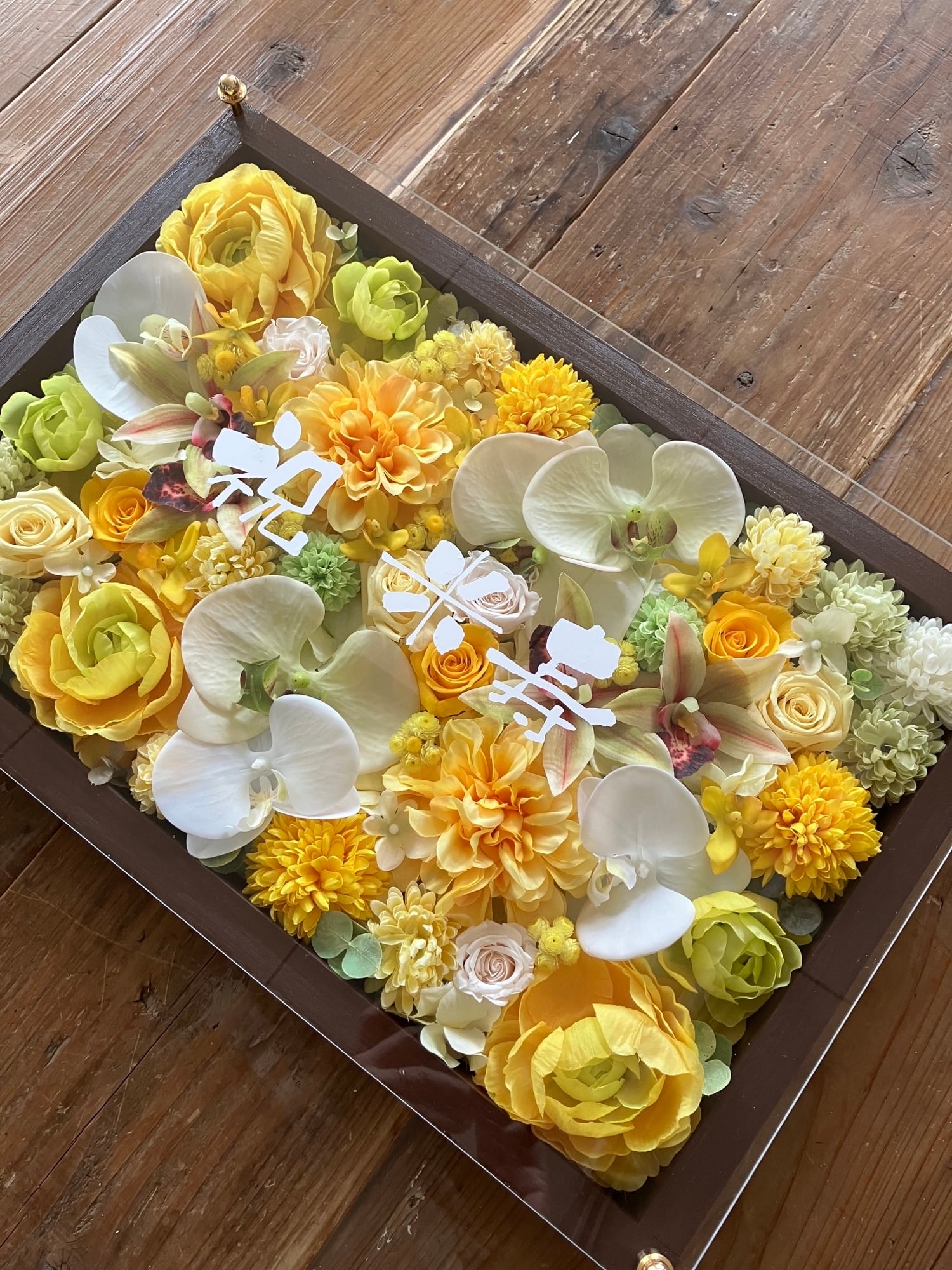 お花いっぱいのギフト|プリザーブドフラワーアレンジ ウッドフレーム〈イエロー〉名入れ可/米寿・開店・開院祝いに
