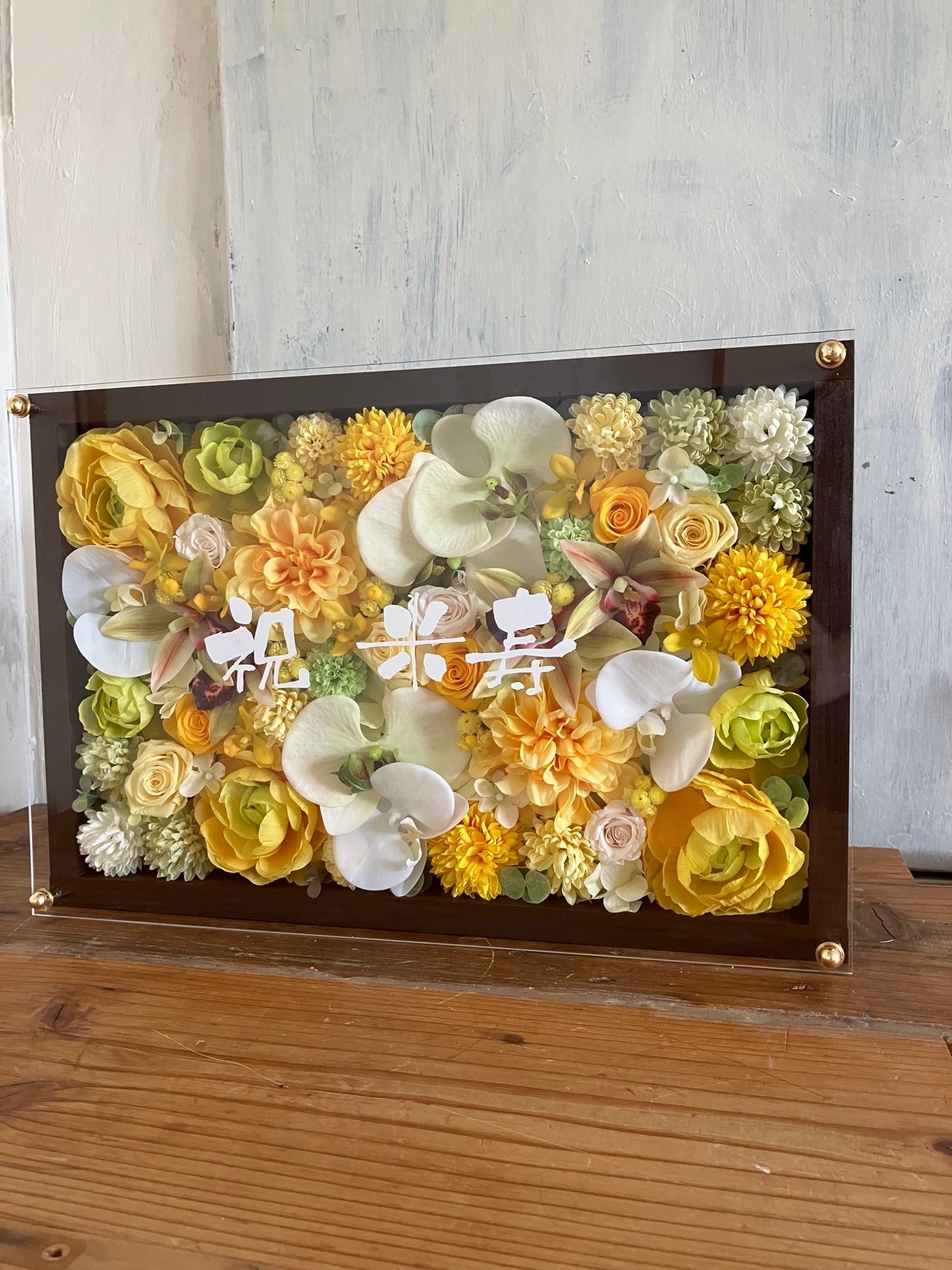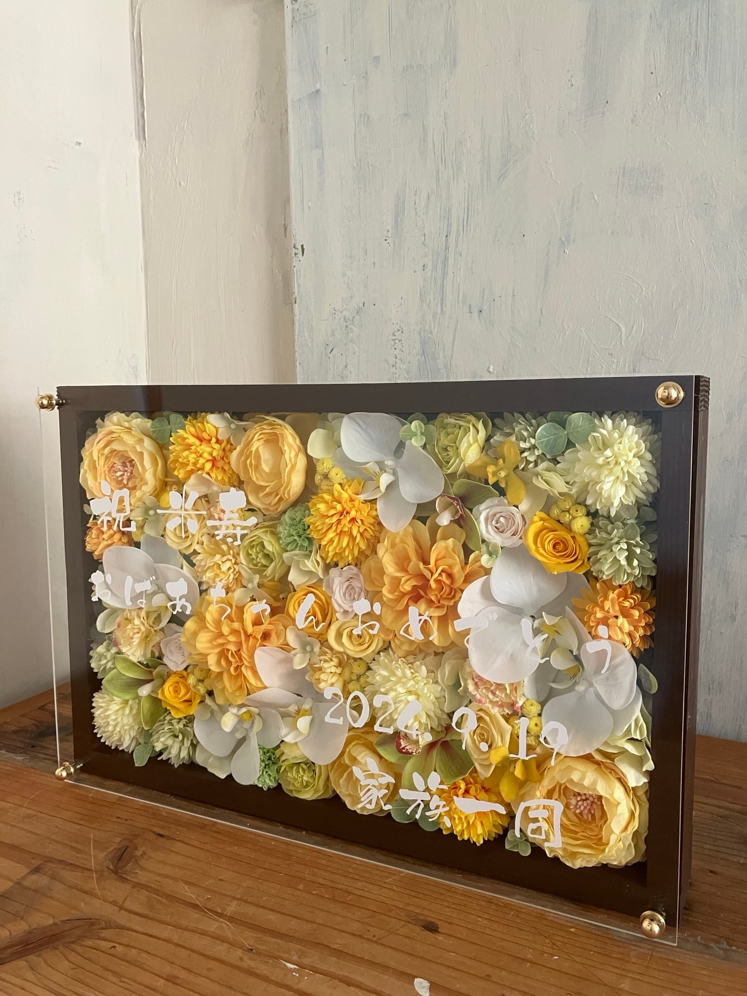 ウッドフレームにプリザーブドフラワーと造花をぎっしり詰め込み、アクリル板にはカッティングシートでメッセージをお入れします。