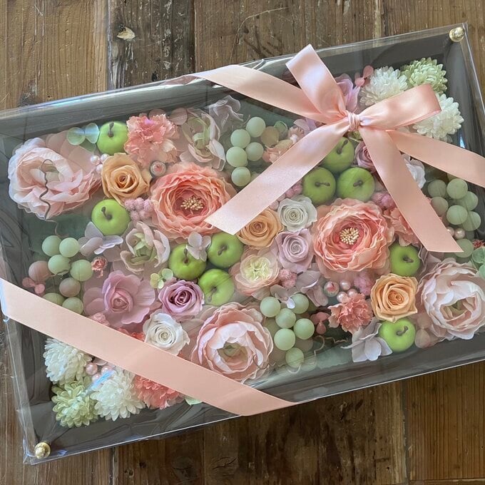 花々がいっぱい詰まったプリザーブドフラワーアレンジメントは、