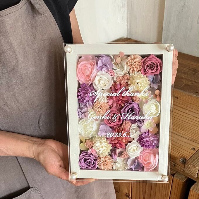 サンクスギフト|両親贈呈品 プリザーブドフラワーアレンジ 結婚式 ウッドフレーム 白枠〈ピンク&ピンクパープル白〉白文字入れ 2個セット