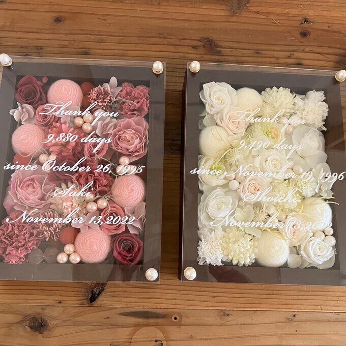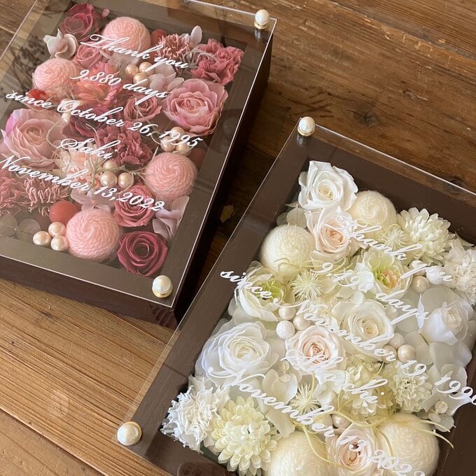 サンクスギフト|両親贈呈品 プリザーブドフラワーアレンジ 結婚式 ウッドフレーム 茶枠〈シックピンク&白〉白文字入れ 2個セット