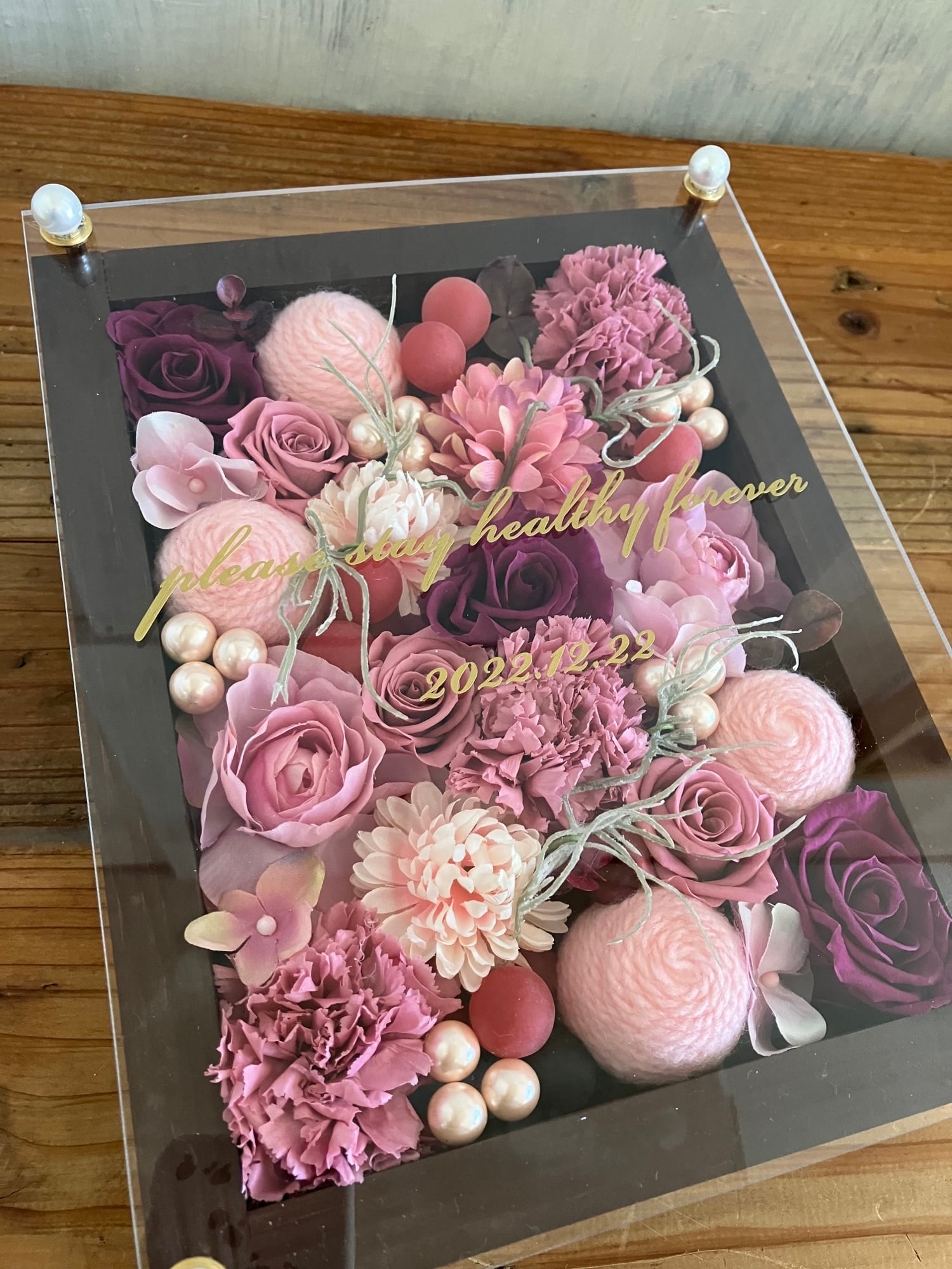 茶色のウッドフレームにプリザーブドフラワーと造花をぎっしり詰め込み、アクリル板にはカッティングシートで名前、挙式日、生まれてから今日までの日数などをお入れします