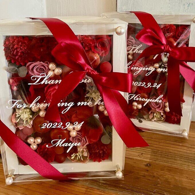 サンクスギフト|両親贈呈品 プリザーブドフラワーアレンジ 結婚式 ウッドフレーム 白枠〈レッドペア〉白文字入れ 2個セット