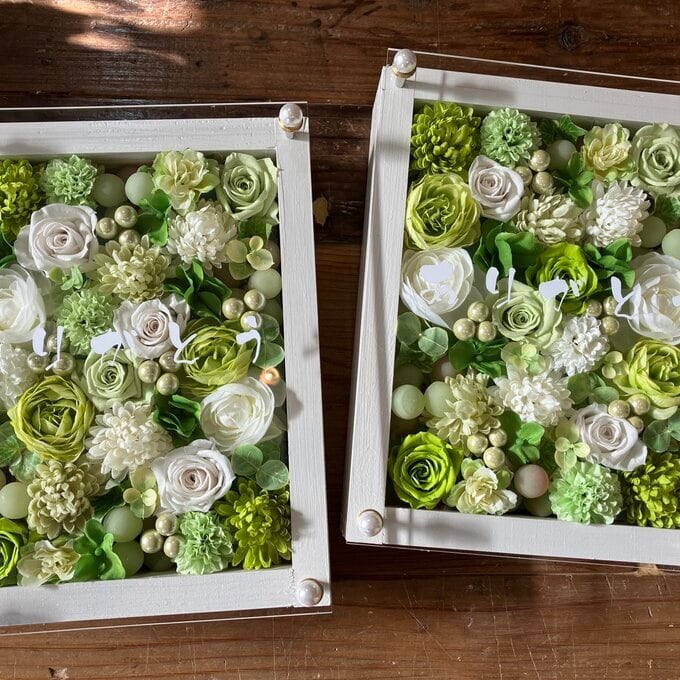 サンクスギフト|両親贈呈品 プリザーブドフラワーアレンジ 結婚式 ウッドフレーム 白枠〈白グリーンペア〉白文字入れ 2個セット