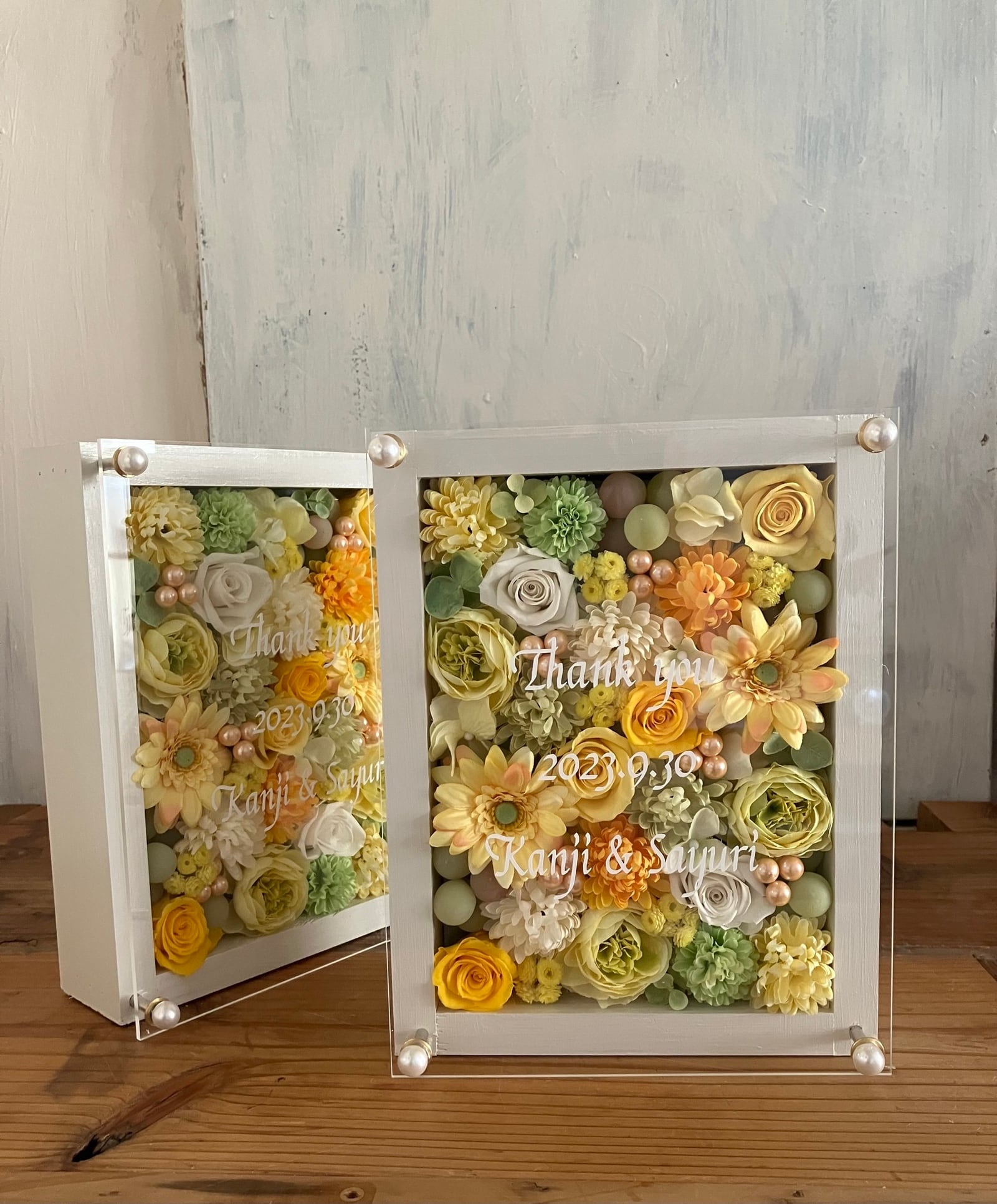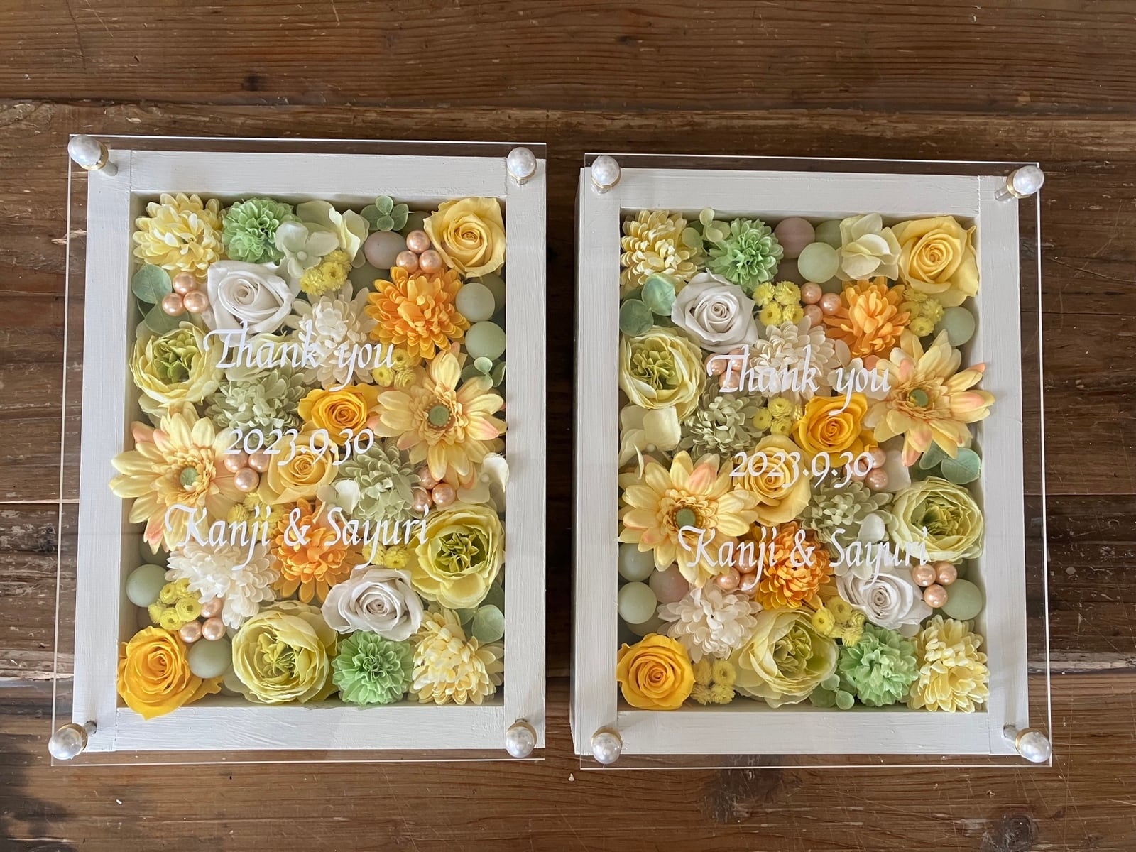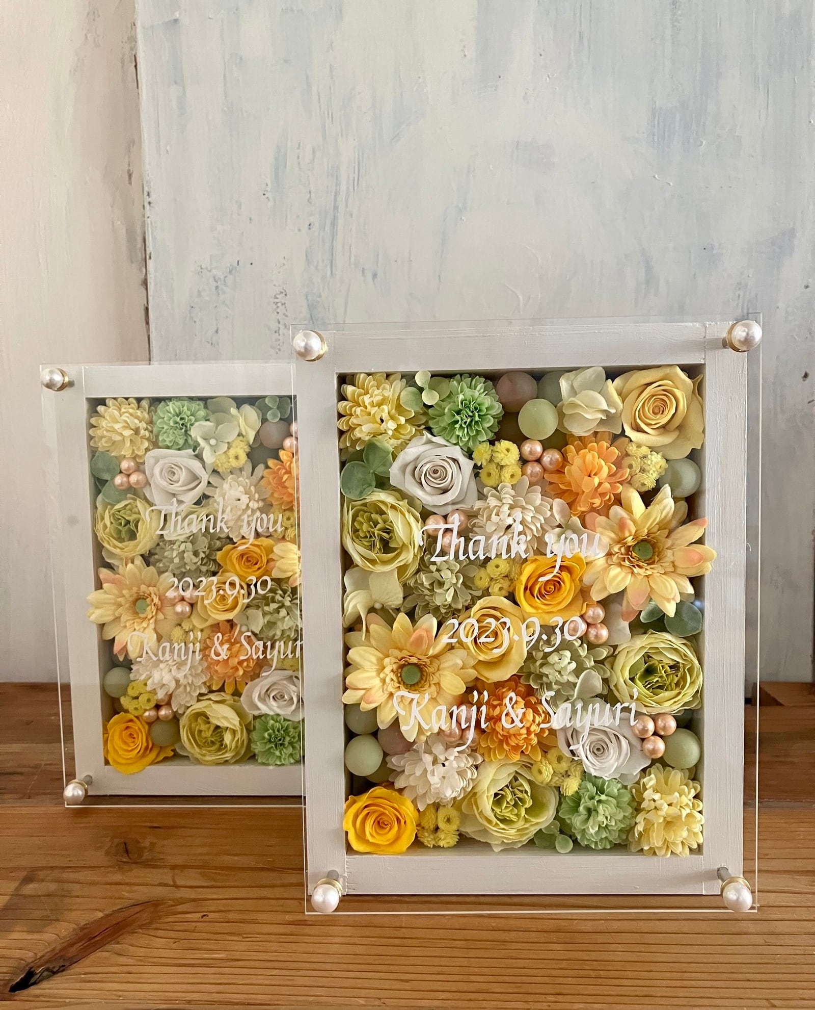 感謝のギフト|結婚式 両親贈呈品 プリザーブドフラワーアレンジ ウッドフレーム 白枠〈レモンイエローペア〉白文字入れ 2個セット