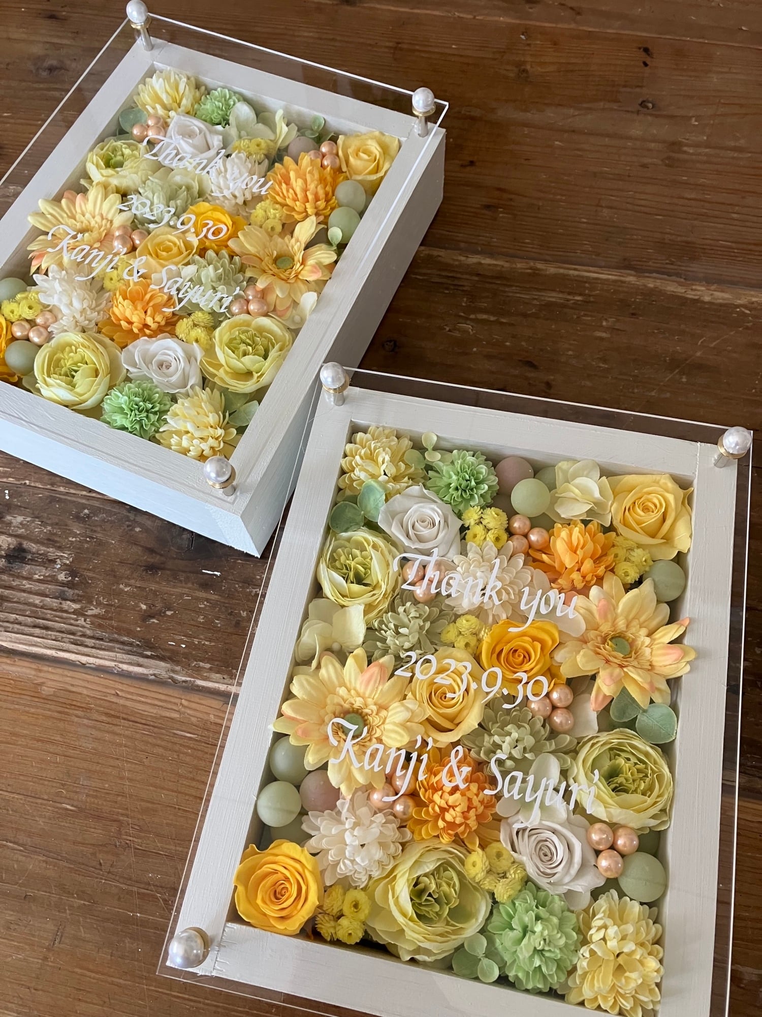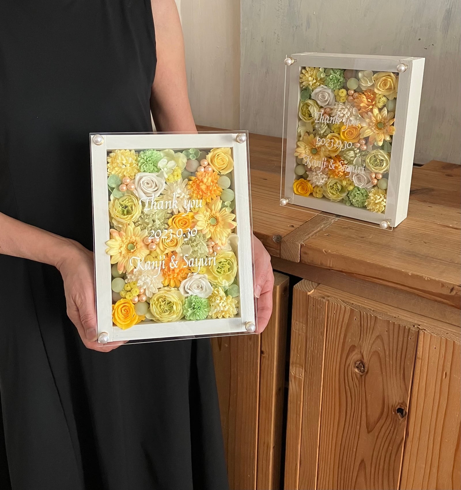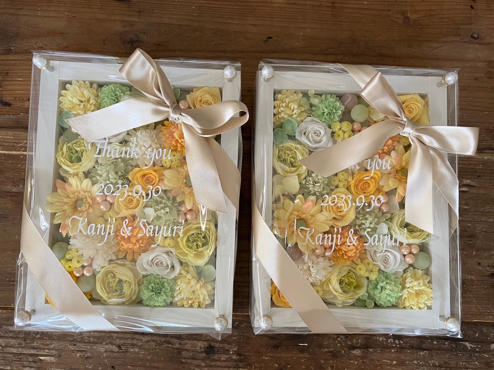 感謝のギフト|結婚式 両親贈呈品 プリザーブドフラワーアレンジ ウッドフレーム 白枠〈レモンイエローペア〉白文字入れ 2個セット