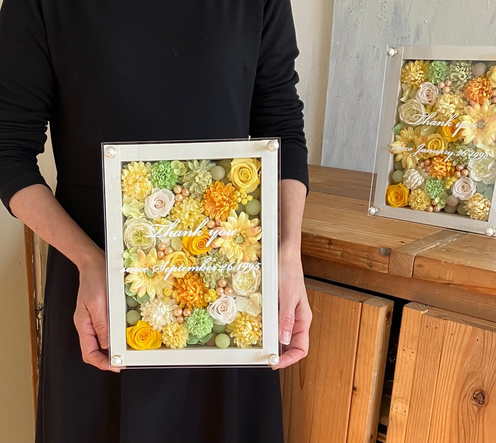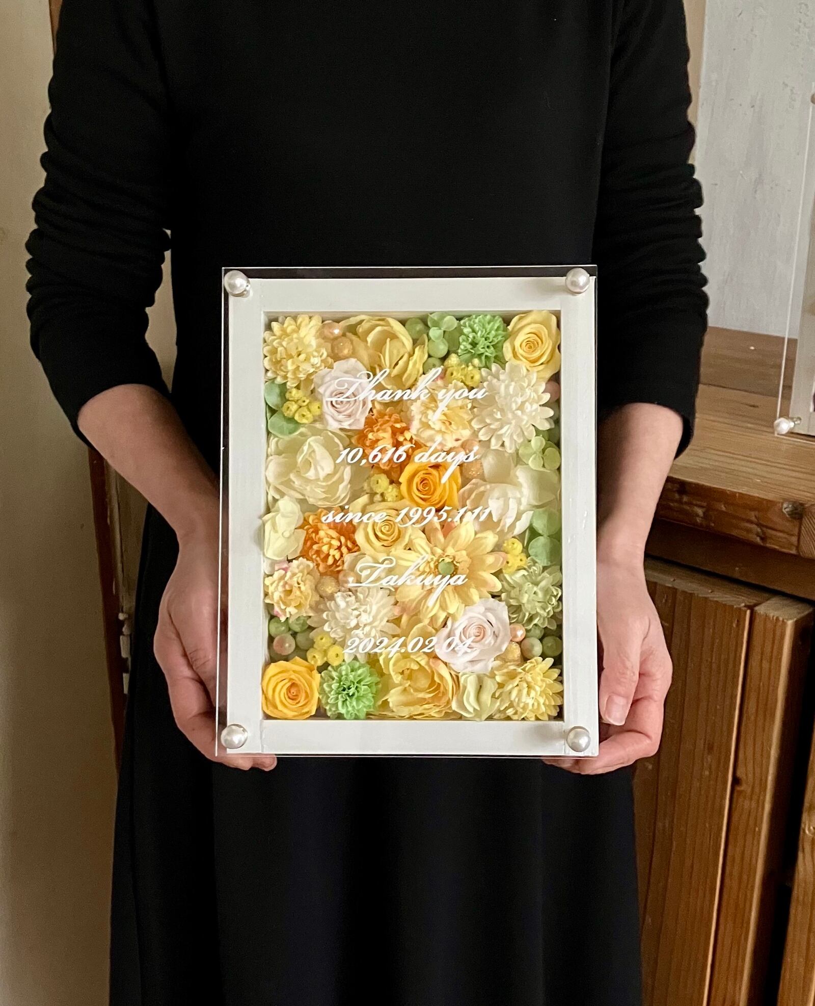 白色のウッドフレームにプリザーブドフラワーと造花をぎっしり詰め込み、アクリル板にはカッティングシートでメッセージをお入れします。