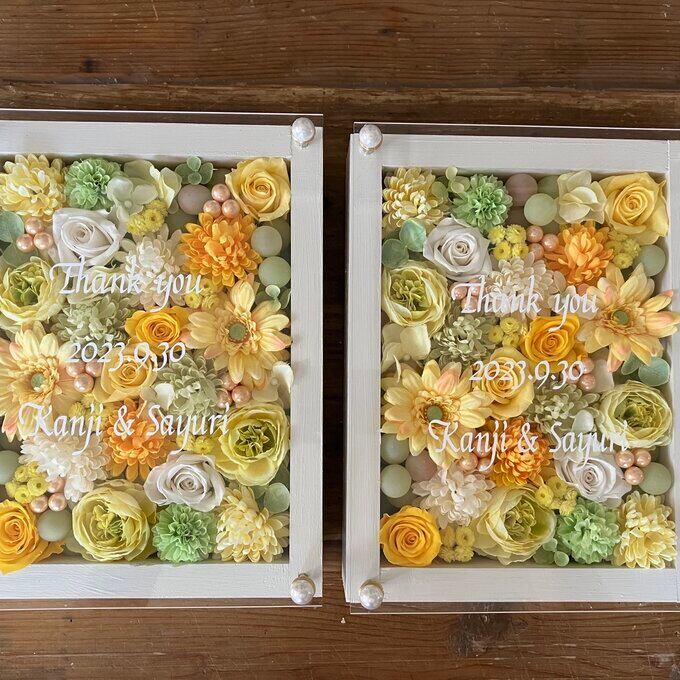 サンクスギフト|両親贈呈品 プリザーブドフラワーアレンジ 結婚式 ウッドフレーム 白枠〈レモンイエローペア〉白文字入れ 2個セット