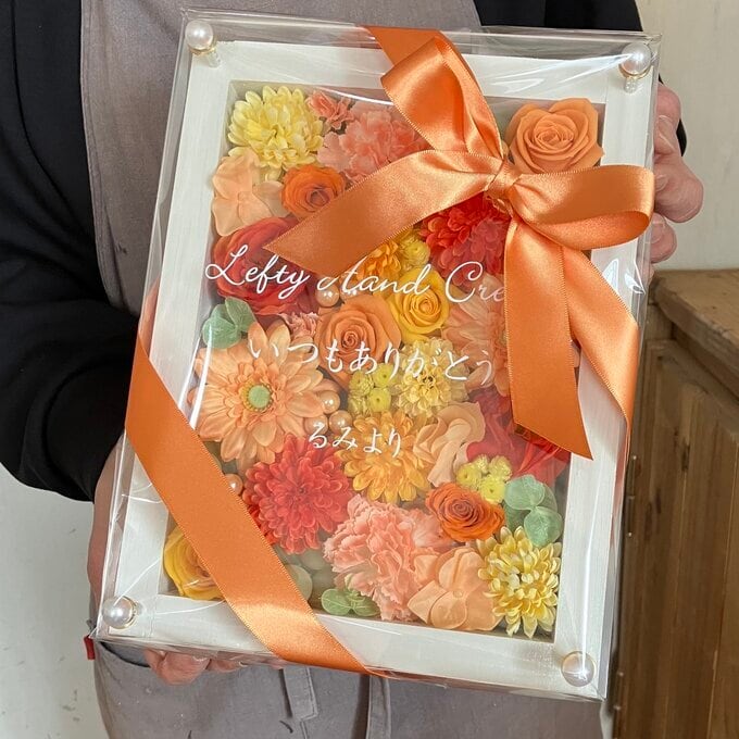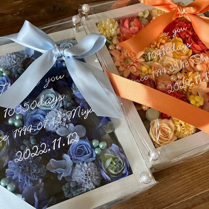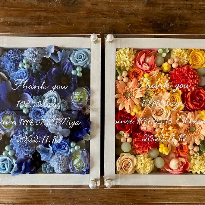 サンクスギフト|両親贈呈品 プリザーブドフラワーアレンジ 結婚式 ウッドフレーム〈ブルー&イエローオレンジ〉文字入れ 2個セット
