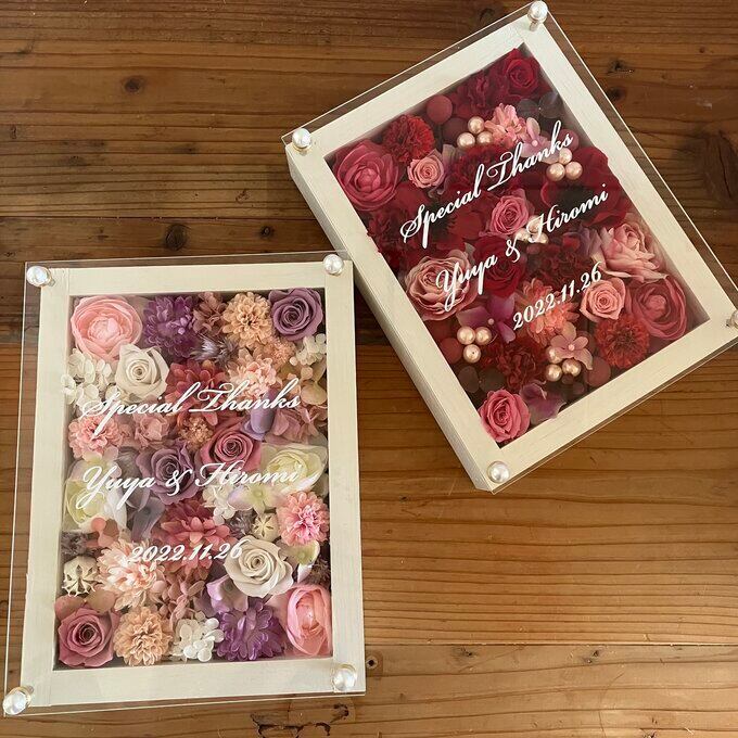 サンクスギフト|両親贈呈品 プリザーブドフラワーアレンジ 結婚式 ウッドフレーム〈赤ピンク&ピンクパープル白〉文字入れ 2個セット