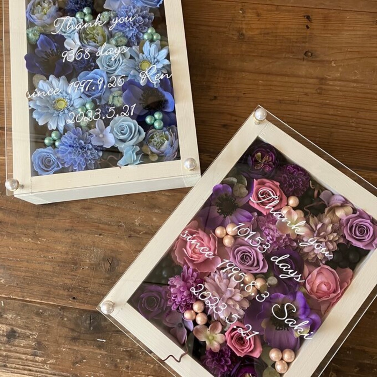 サンクスギフト|両親贈呈品 プリザーブドフラワーアレンジ 結婚式 ウッドフレーム〈ブルー&パープル〉文字入れ 2個セット