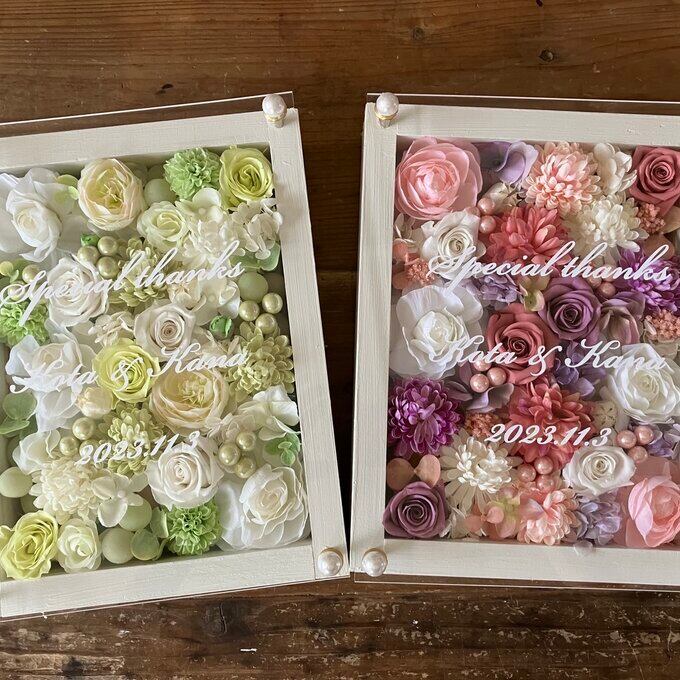 サンクスギフト|両親贈呈品 プリザーブドフラワーアレンジ 結婚式 ウッドフレーム〈白グリーン&ピンクパープル白〉文字入れ 2個セット