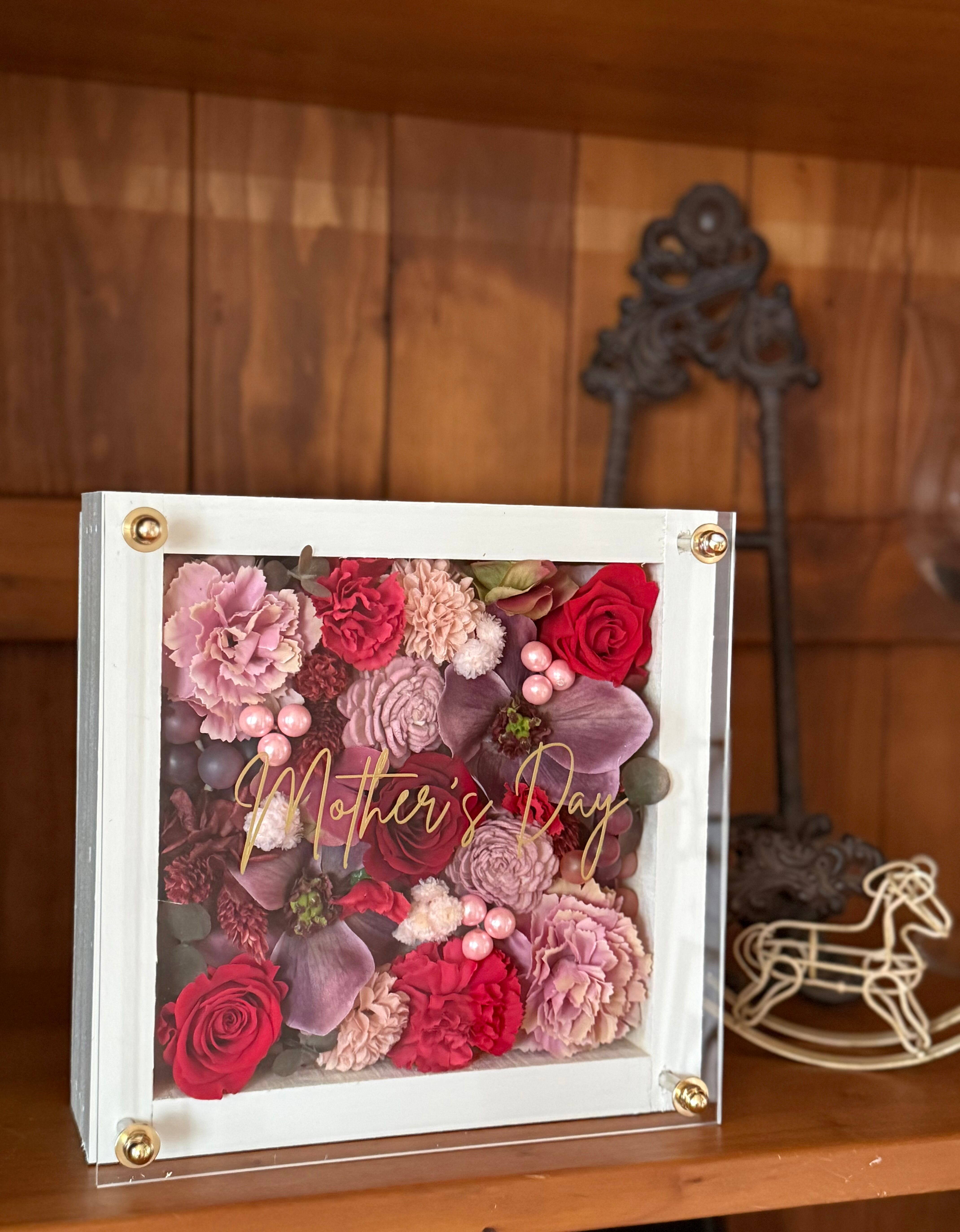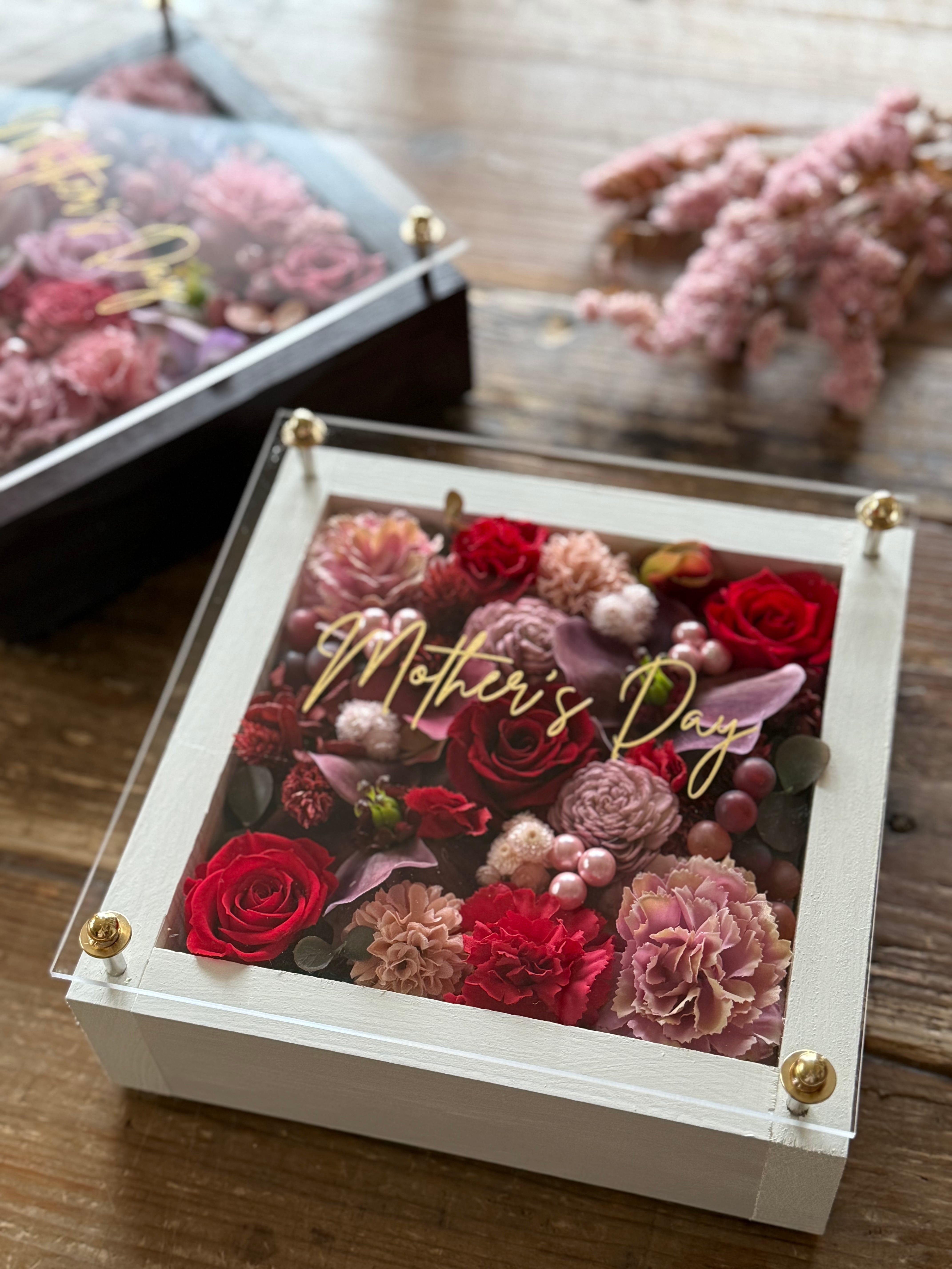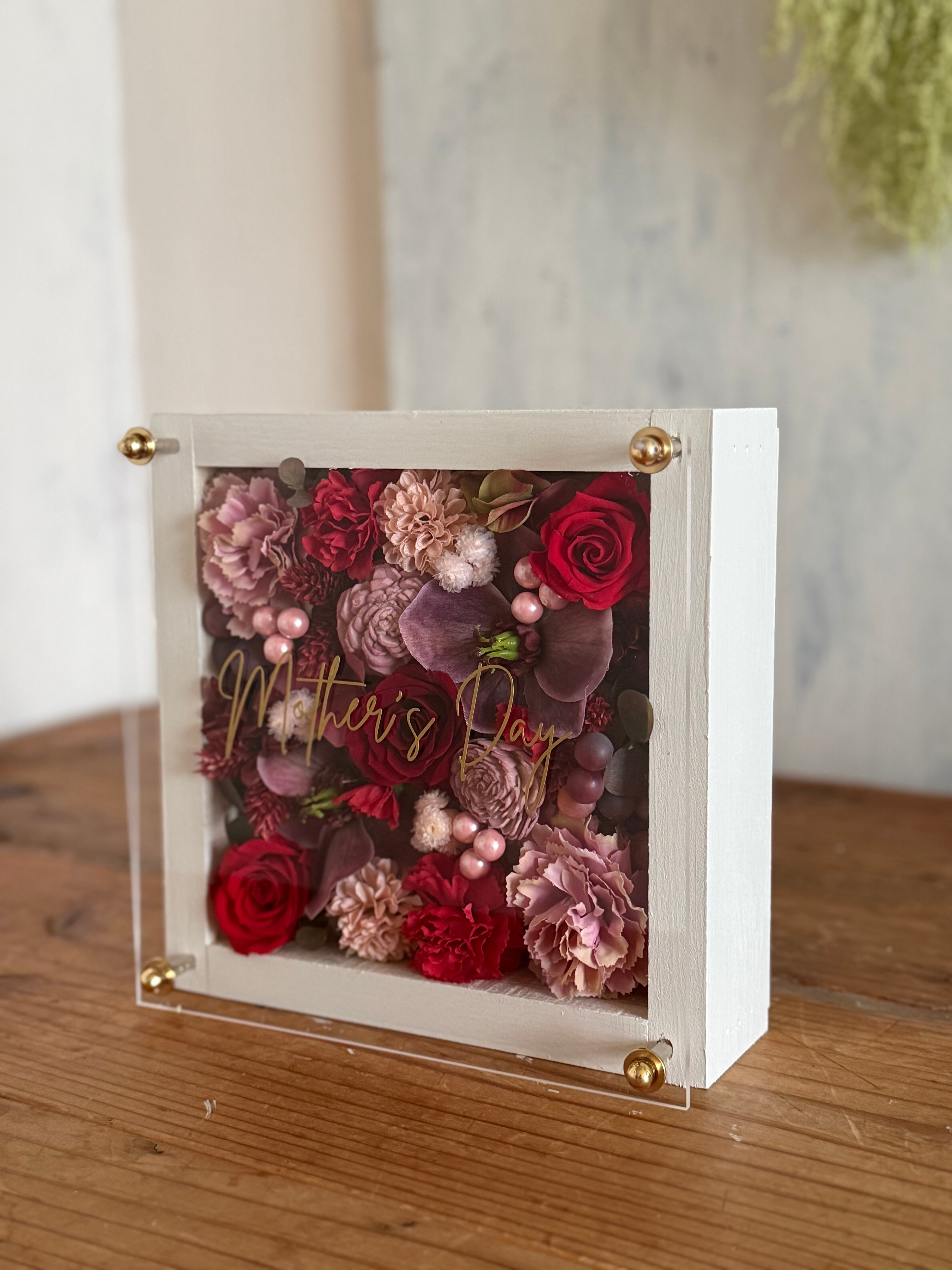 母の日ギフト プリザーブドフラワーアレンジメント【母の日限定】ゴールド文字入れ ウッドフレーム 白木枠〈赤バラ〉