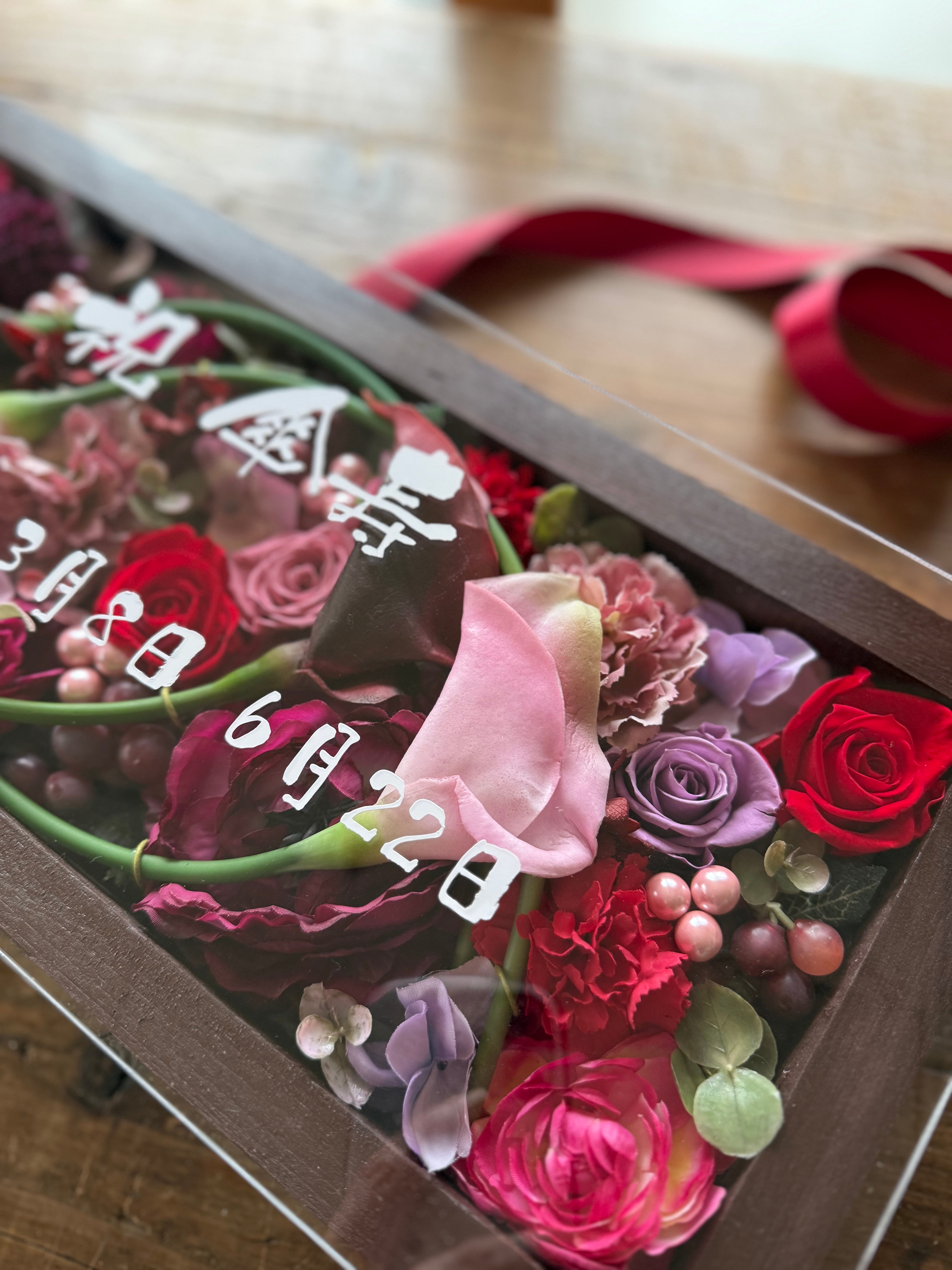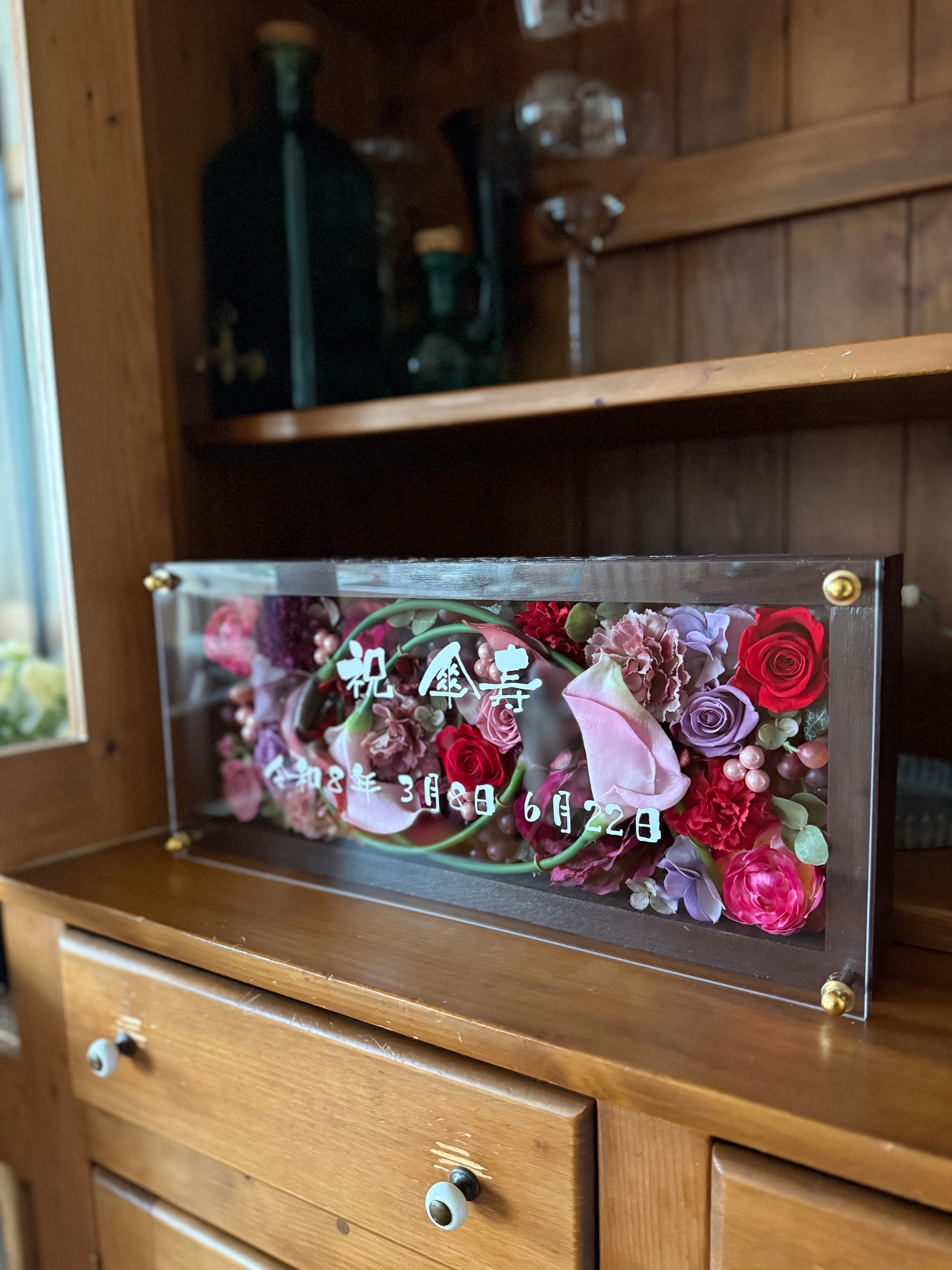 ロングサイズのウッドフレームにプリザーブドフラワーと造花をぎっしり詰め込み、アクリル板にはカッティングシートでメッセージをお入れします(木枠にも文字入れ可能)